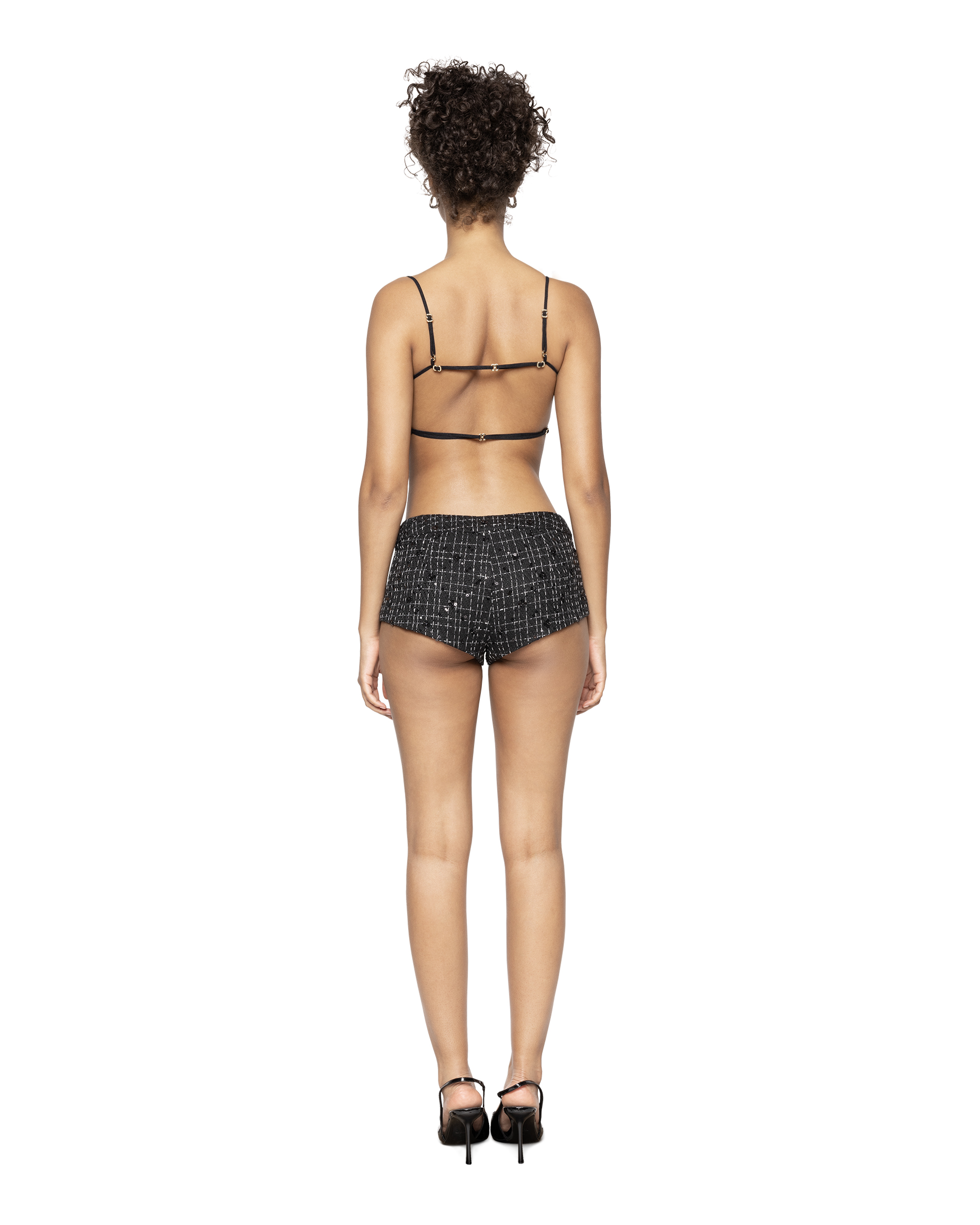 Crafted from luxurious sequinned black tweed, this bra is defined by graphic lines, accentuated with a precious white braid, and exudes sophistication through understated simplicity.